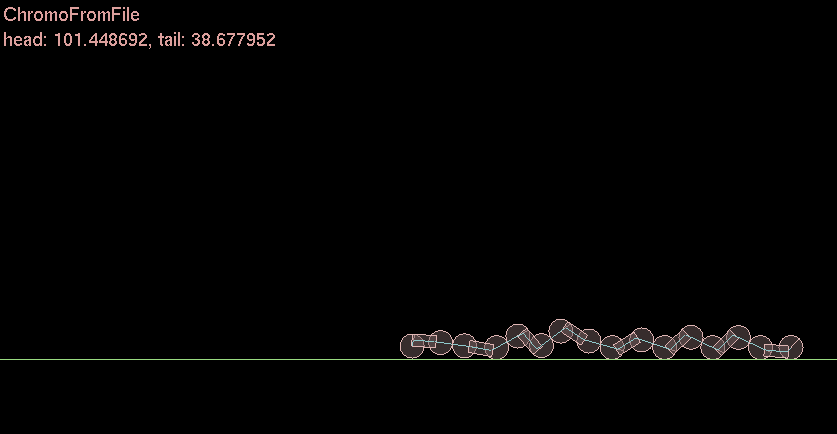 In this simple caterpillar example each joint represents a “motor” or “muscle” that is activated by the sigmoid. Zero or One. Move + Stay