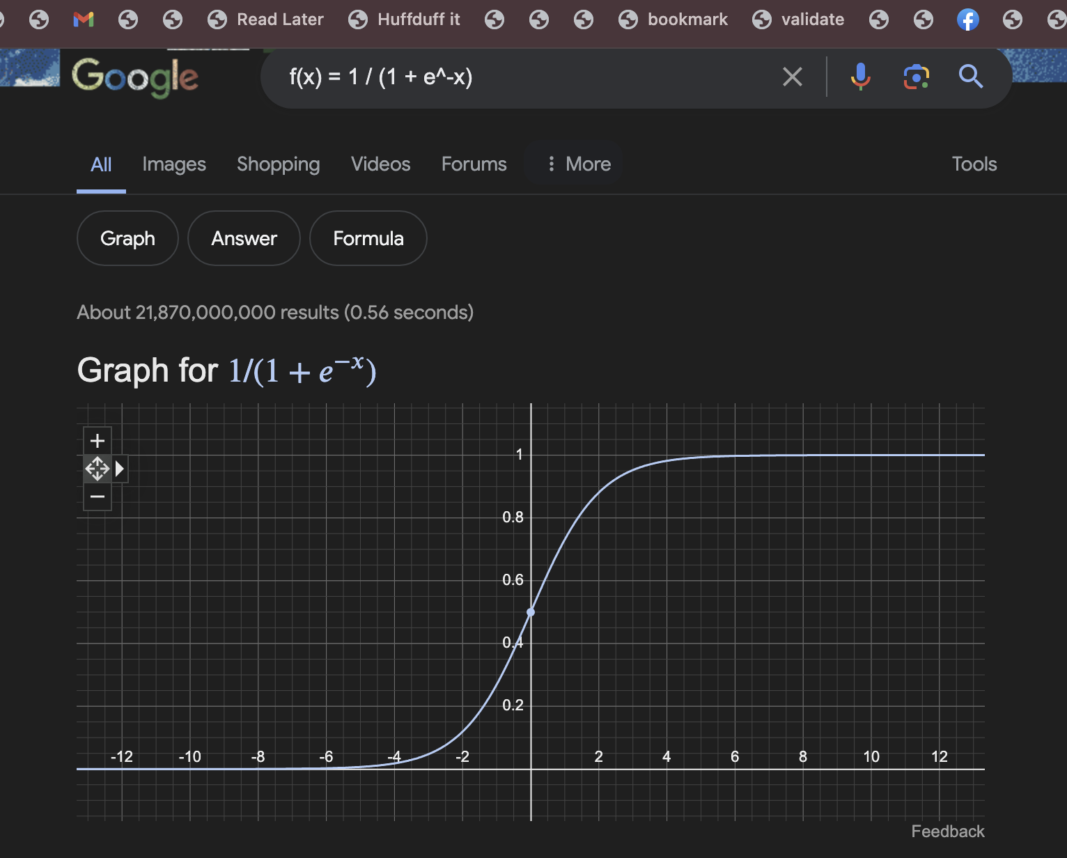 When we plug a negative number into this formula, we get a number very close to 0. When we plug in a positive number, we get a number very close to 1. And when we plug in zero, we get 0.5. So you can see how the sigmoid function maps any input number to a value between 0 and 1.