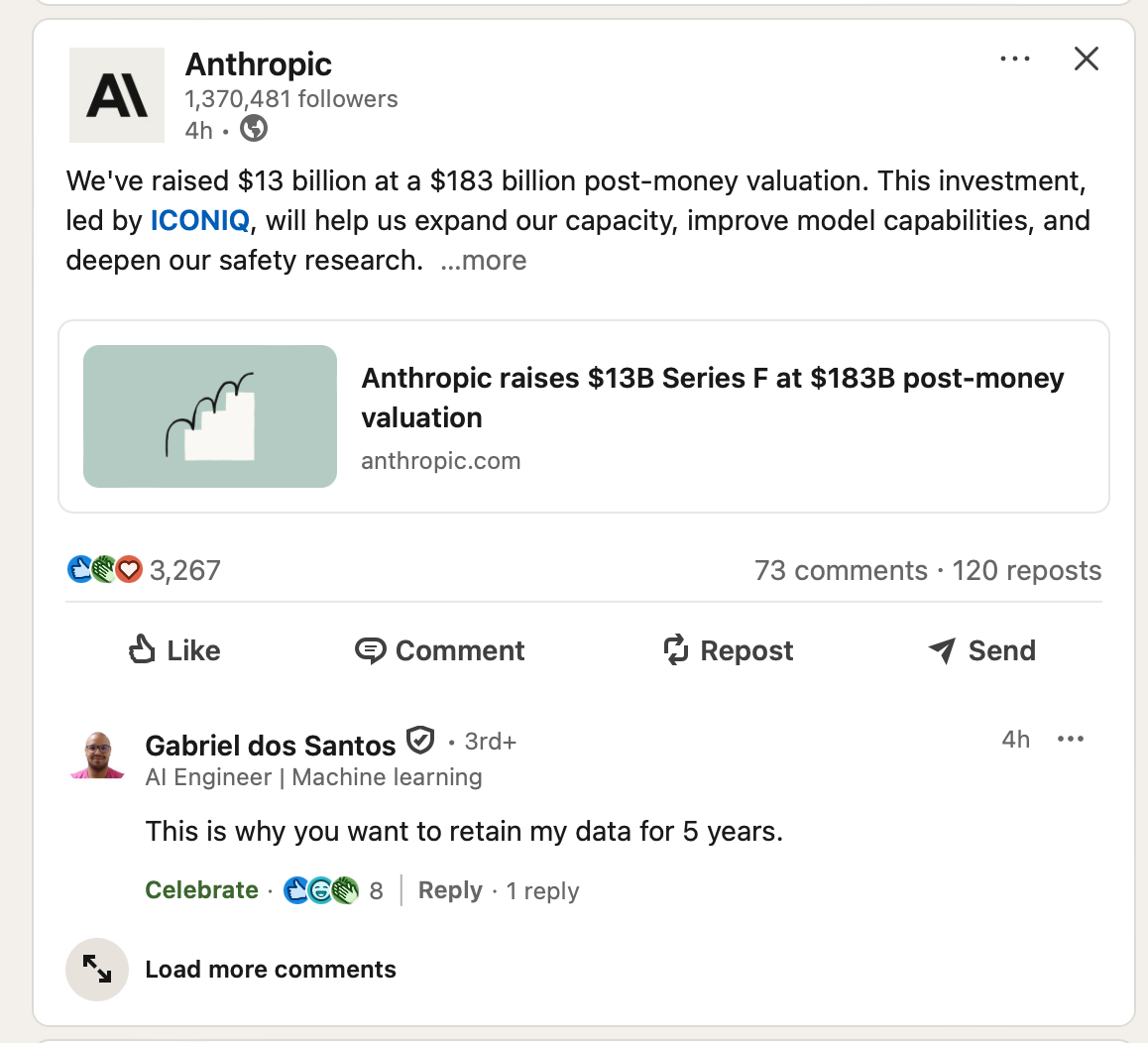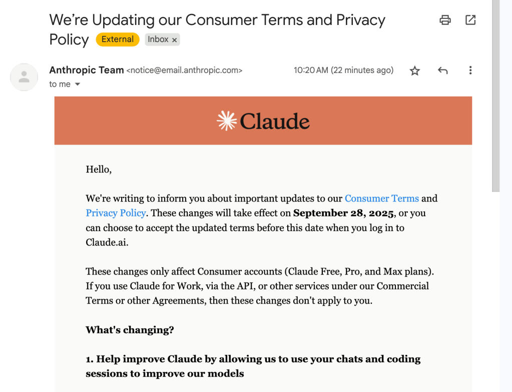 OpenAI famously only trains on your inputs/outputs to its system if you don’t pay them. Anthropic (Claude) said it never trained on your chats. I figured this was mostly a temporal thing. They could always revise their terms of service and do whatever they want. They increased their data retention policy also in this announcement to 5 years… How can they safely incorporate my chats into its training corpus!? The fact that I have to opt-out is interesting and I don’t believe everyone who clicks “agree” fully understands what this implies.